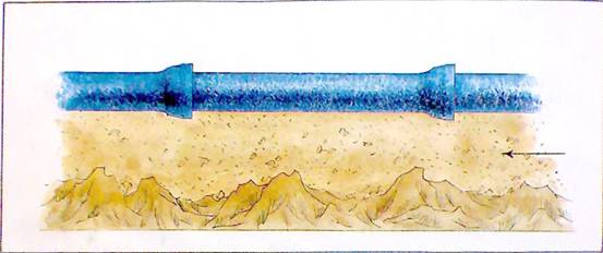 在多是石塊的土層情況下,為保護(hù)管子有條理地連續(xù)置放,應(yīng)考慮安裝層的問(wèn)題(松軟土質(zhì)不必考慮)。安裝層由松軟的顆粒狀物質(zhì)組成(沙土、小碎細(xì)石粒、過(guò)篩土),其厚度應(yīng)保證底部距石塊層最小距離≮100㎜。見(jiàn)圖1