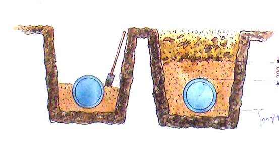 掩埋要用不含沙子、草、樹(shù)根、雜物的土,埋深至少要高出管子上部母線(xiàn)200㎜.管子兩邊的土要夯實(shí),然后在其上部再埋200-300㎜土層,也夯實(shí)。見(jiàn)圖7