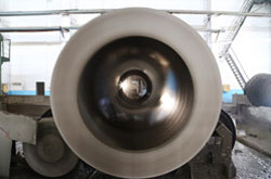 ●工藝簡(jiǎn)要:將承口芯安裝到離心機(jī)上,球化合格的鐵水倒入定量包內(nèi),按照工藝規(guī)定要求,設(shè)定孕育劑加入量、管模粉加入量,計(jì)算機(jī)控制離心機(jī)的旋轉(zhuǎn)速度、行走速度及定量包的翻轉(zhuǎn)速度,鐵水隨著定量包的翻轉(zhuǎn)及離心機(jī)的行走澆注在旋轉(zhuǎn)的管模內(nèi),并凝固成管子,拔管鉗將管子從模內(nèi)拔出。